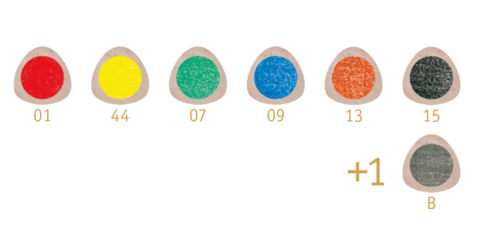 Colors: 01 carmine red | 44 mid yellow | 07 green | 09 blue | 13 rust | 15 black | graphite pencil B +1